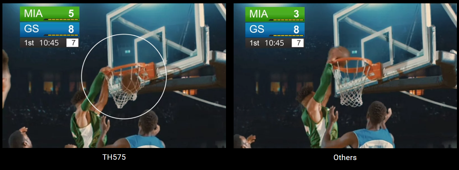 TH575 features the best contrast with 0.65 DMD in 1080p projectors, produces deeper black, and resolves subtle layers and fine details in dark scenes without washout.