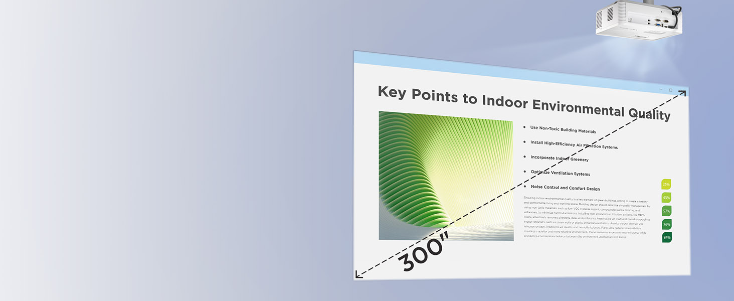 Projects screen sizes from 30" to 300" with a throw distance of 3.9 ft - 43 ft; displays a 100" image from 13 ft