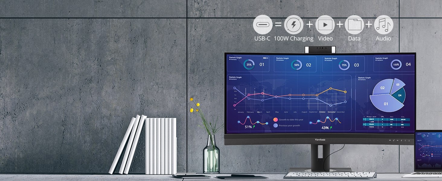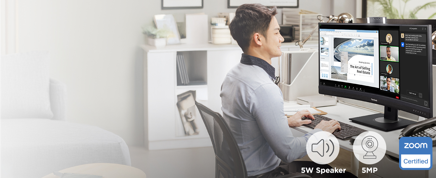 ViewSonic VG3457CV video conferencing monitor is an ultrawide docking monitor with premium features such as a Zoom certified pop-up webcam that will help maintain productive meetings whether in the office or working from home. Premium webcam features to improve visual and audio aspects of video calls such as built in LED lighting, and powerful speakers. The IR camera allows for secure and easy sign-on with Windows Hello.The 21:9 aspect ratio provides extra screen space, while the 1500R curved screen offers an immersive viewing experience. Reliable network connectivity is ensured with an integrated Ethernet port, and the latest USB Type-C connectivity provides up to 100W power delivery to your laptop. Additionally, the integrated USB hub allows for easy connecting and charging of peripherals and accessories.