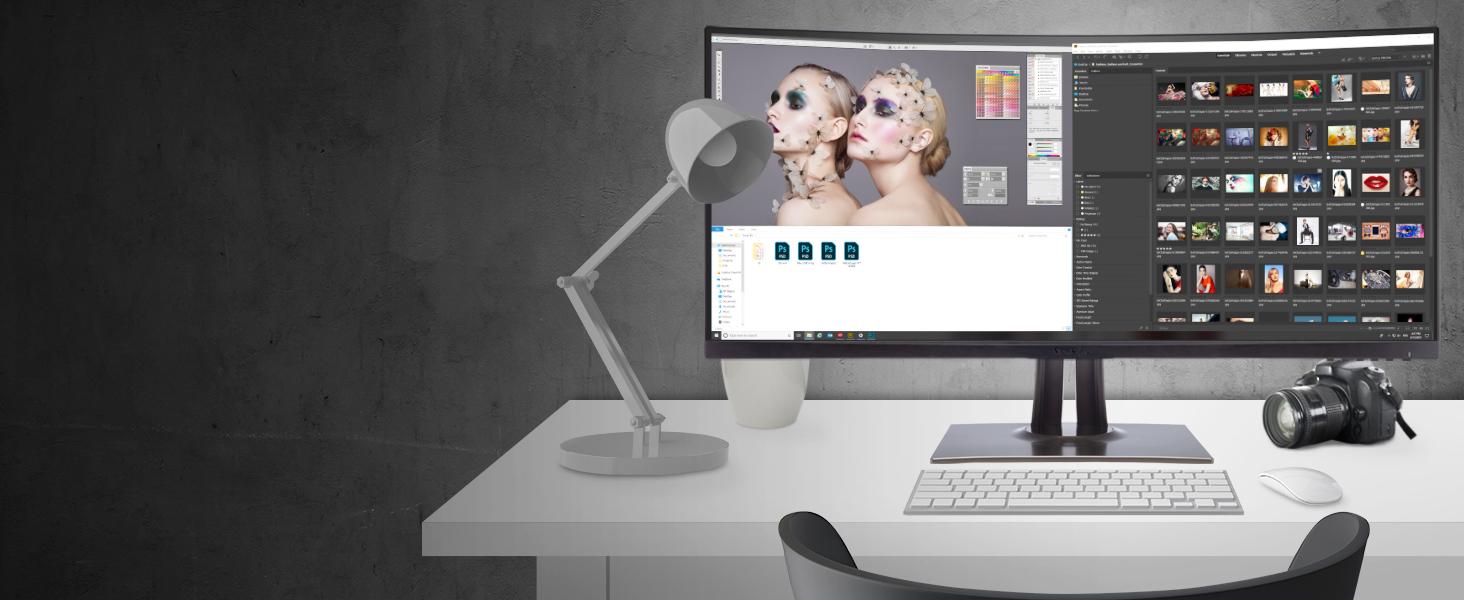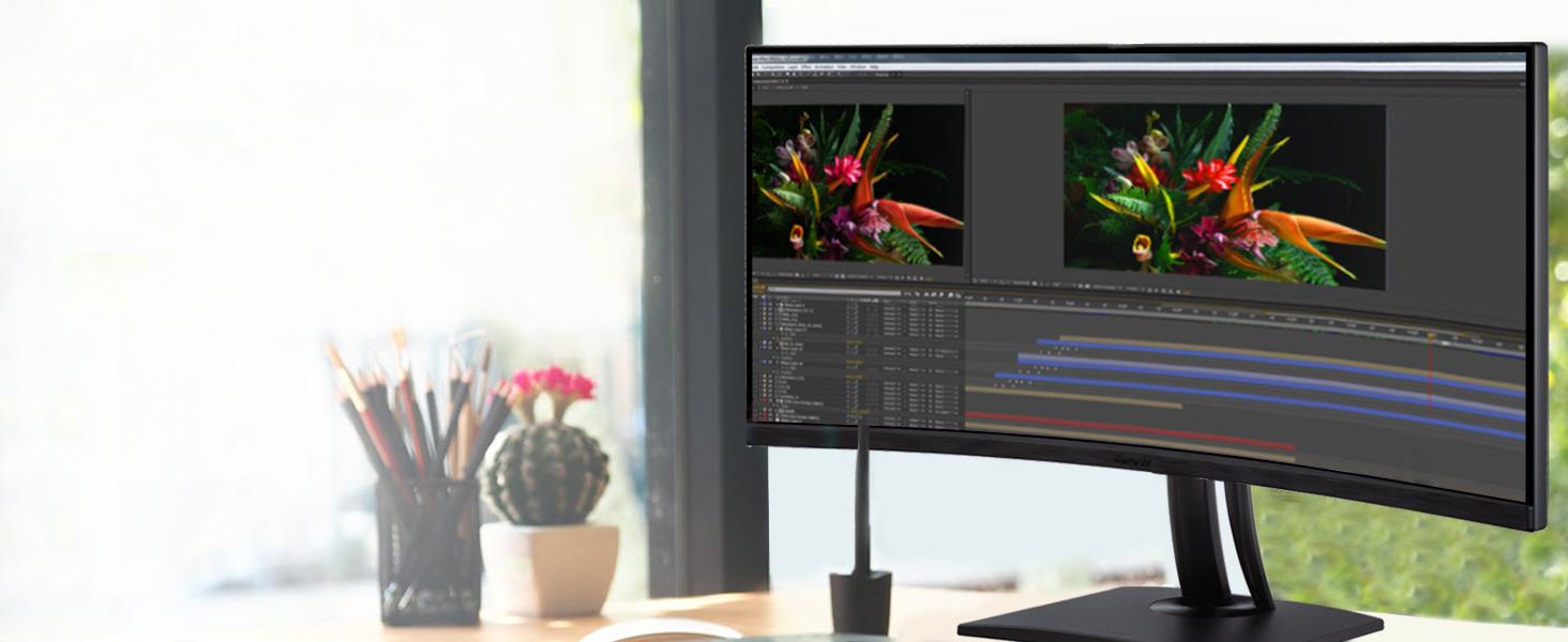 The 21:9 ultrawide screen is ideal for editing long timelines, syncing music, and making movie magic. For a more efficient workflow, open multiple windows side by side.