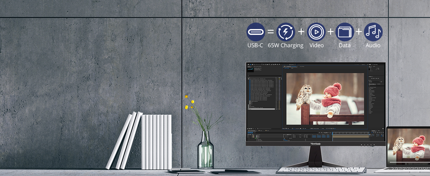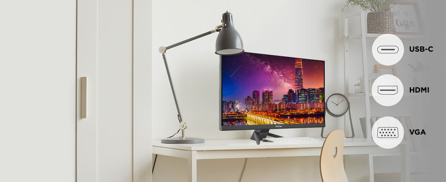 The ViewSonic® VX2467U is a 24" Full HD monitor that combines style with optimal versatility and functionality. Whether for streaming, editing or gaming, these sleek and slim displays are engineered with the everyday user in mind and are perfect for home use. With a 3-sided frameless design, this monitor provides a near-seamless viewing experience ideal for multi-monitor setups. USB 3.2 Type-C connectivity delivers 65W charging power, video, and audio over a single cable, while HDMI and VGA inputs keep you connected to your favorite devices.