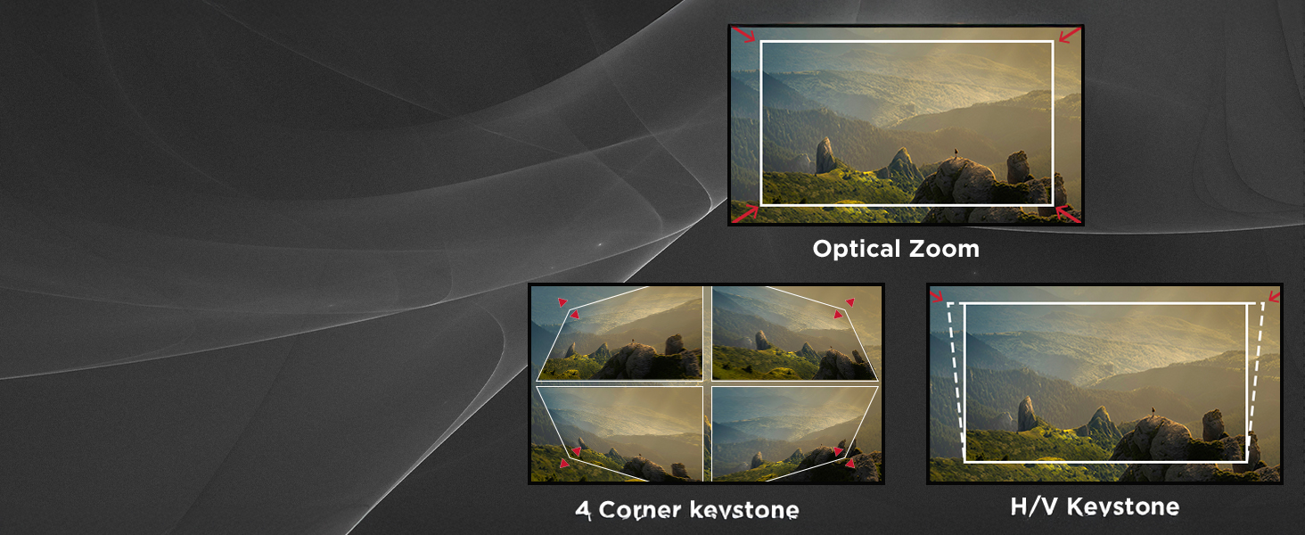 1.36x digital zoom, auto focus, vertical/horizontal keystone, and 4-corner adjustment for flexible setup